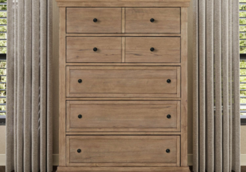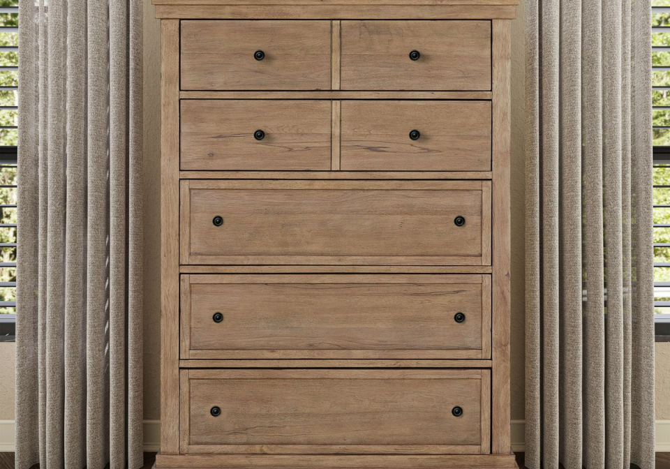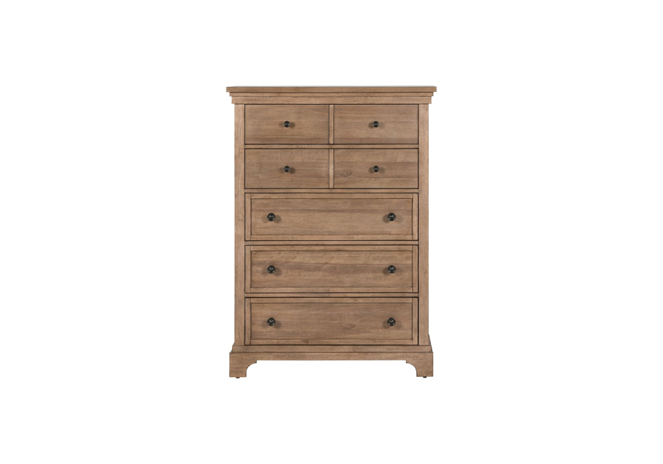 The Haven Hills 5 Drawer Chest is crafted of Rubberwood solids with Rustic Birch veneers in a warm Camel Beige finish. Its clean lines and traditional silhouette are enhanced by two bluff cut top drawers, offering the look of multiple drawers with the convenience of deep storage. Premium felt lining in the top drawer and a cedar-lined panel in the bottom add a touch of luxury. Finished with Burnished Brass knob hardware, the chest features elegant under top molding, block pilasters, and step base molding with shaped bracket feet for timeless appeal.