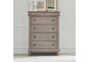 Achieve a casual traditional look with the Rustic Traditions drawer chest. Crafted with Rubberwood solids with Rustic Birch veneers, this piece features bottom case dust proofing, felt lined top drawer, and fully stained interior drawers. This Louis Philippe style 5 drawer chest features chamfered pilasters and bun feet, adding to the casual feel.