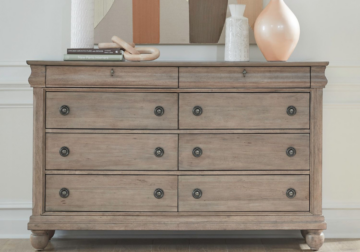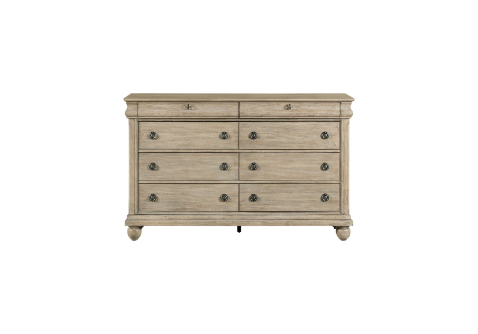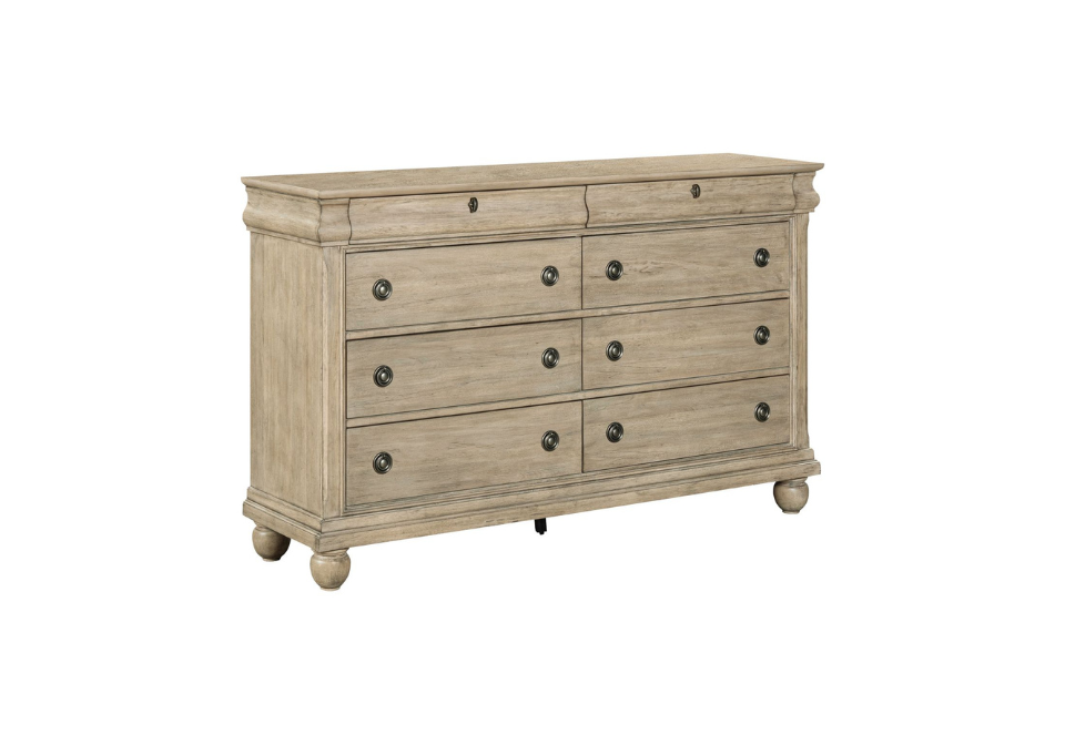 Achieve a casual traditional look with this 8-drawer dresser. The Saddle Tan finish is attained through Rustic Birch veneers and a well-worn look. Organize your clothing using the 6 large drawers and 2 smaller drawers. The Louis Philippe style dresser features chamfered pilasters and bun feet, adding to the casual feel.