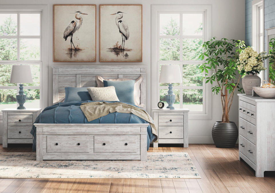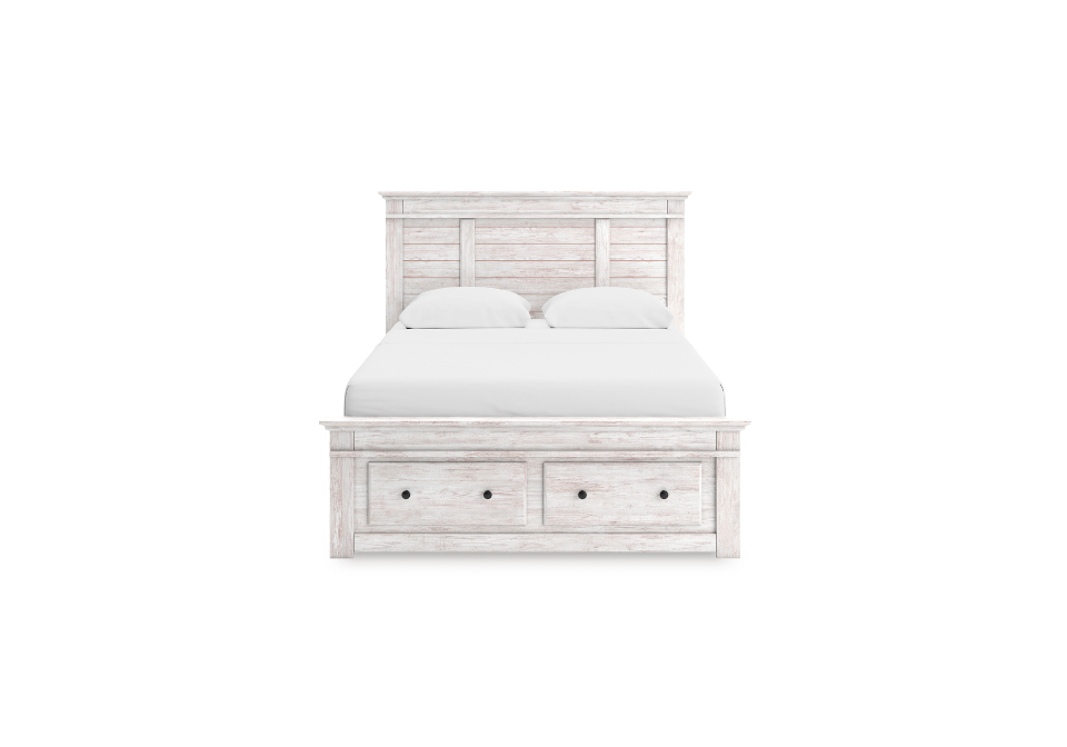 - Includes panel headboard, storage footboard, under bed storage unit, platform rails and roll slats