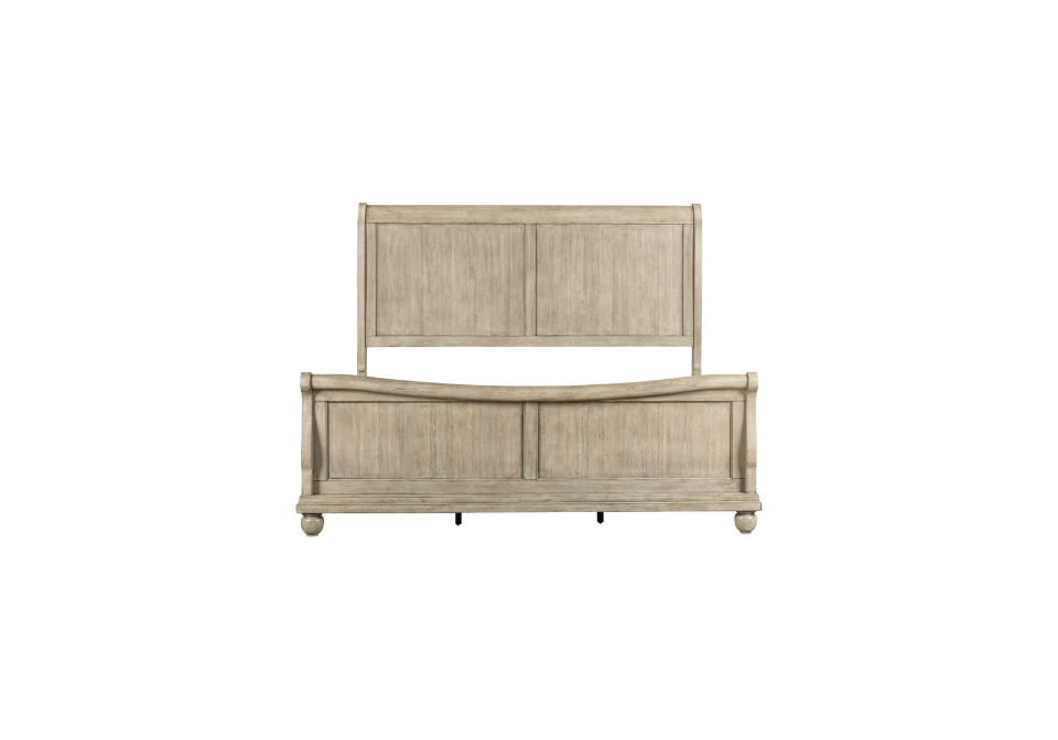 Invite this casual yet traditional Rustic Traditions sleigh bed into your home. The Saddle Tan finish enhances the classic Louis Philippe styling of the bed. Make a statement with the rolled back headboard and a footboard that features a rolled cap rail, creating a nice motion. Crafted with Rubberwood solids with Rustic Birch veneers, the bolt-on rails and center supported slat system ensure that this is a sturdy and reliable bed.
