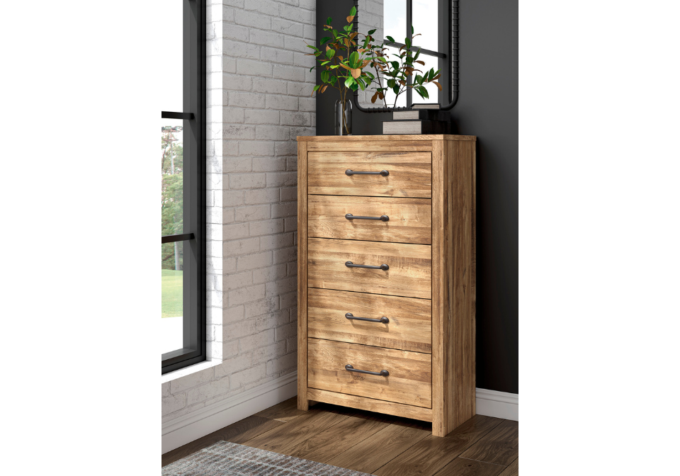 - Includes king bed, dresser, mirror, chest, and nightstand.