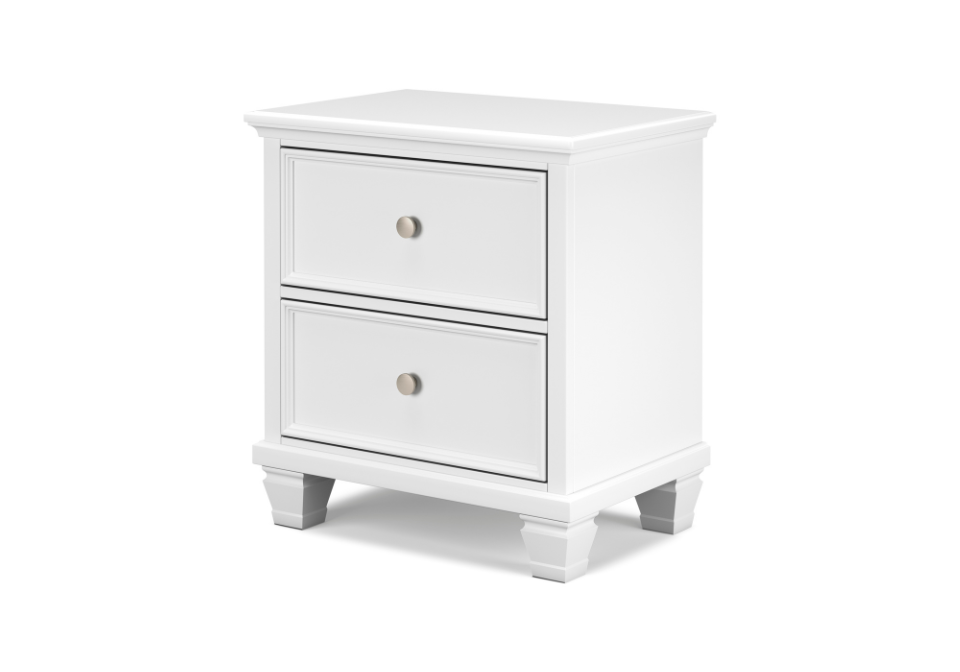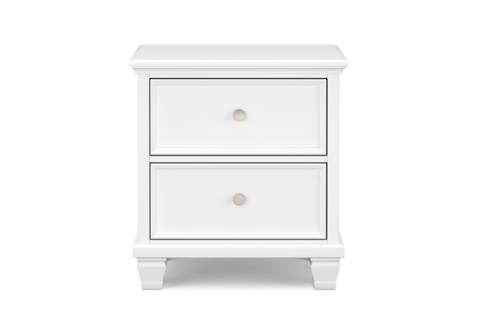 Exuding a timeless casual design, this nightstand is ready to define your personal space. It easily adapts to a variety of interiors, combining a clean, contemporary white finish with framed drawer fronts and round metal knobs. Featuring two storage drawers with dovetail construction and traditional tapered feet, this piece is sure to bring elegant simplicity to your bedroom.