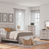 - Includes queen bed, dresser, mirror, chest, and nightstand.
