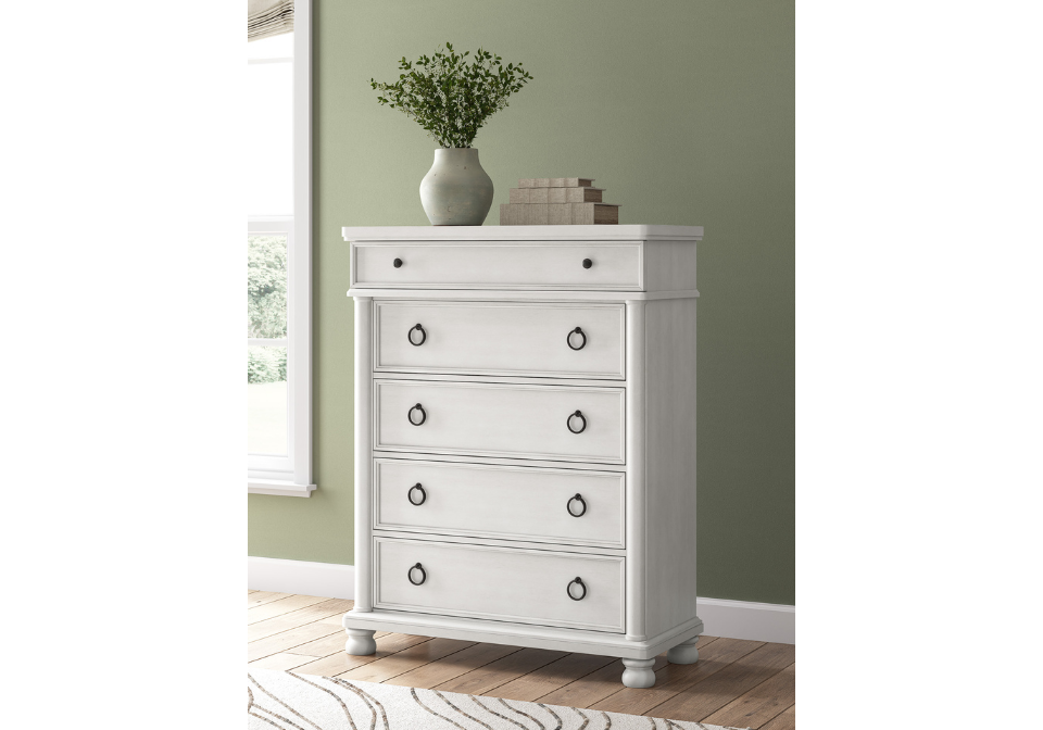 - Includes dresser, mirror, nightstand, chest, and queen bed.