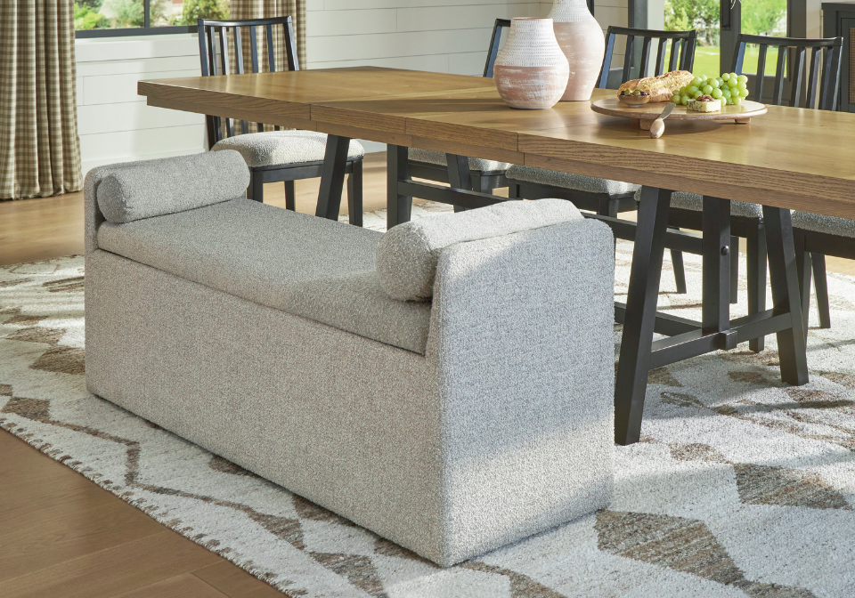 This upholstered dining bench brings a rustic vibe to urban contemporary design. It’s a modern approach to everyday function, with storage hidden under the seat. And the bench’s neutral color is stunningly simple, allowing it to coordinate seamlessly with your existing decor.
