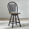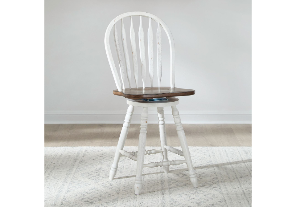 The Carolina Crossing Windsor Swivel Counter Chair brings classic charm and easy comfort to your kitchen or dining space. Crafted of Rubberwood solids in a warm Antique Honey finish, this arrow back Windsor-style chair features a swivel saddle-shaped seat for smooth movement and added comfort. Multi-turned splayed legs flow into a turned footrest, offering both style and support. Thoughtful details like nylon chair glides help protect your flooring, making this timeless counter-height chair as practical as it is inviting.