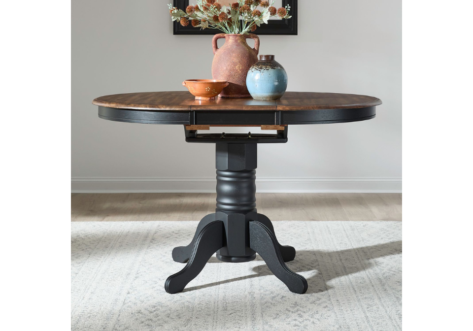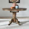 The Carolina Crossing Gathering Table brings timeless style and everyday functionality to your dining space. Crafted of Rubberwood solids in a warm Antique Honey finish, this table features a 15-inch butterfly leaf, perfect for expanding your seating with ease. A rounded table edge softens the silhouette, while square bead molding along the apron adds a touch of traditional charm. The table is anchored by a multi-turned pedestal base with shaped bracket feet and adjustable floor levelers, offering both elegant detail and sturdy support for gatherings big and small.