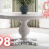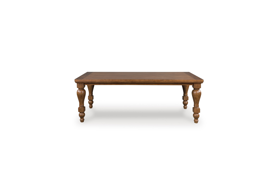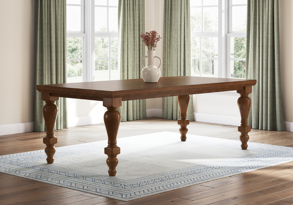 Relaxed living and cozy comfort—that’s what traditional farmhouse design is all about. And what better way to embrace your love of rustic country style than with this dining table. Celebrating the beauty of simplicity, its thick wood-tone top and chunky turned legs marry functionality with classic appeal for a fresh feel. Feel free to pair this table with assorted chairs in the collection for an eclectic look.