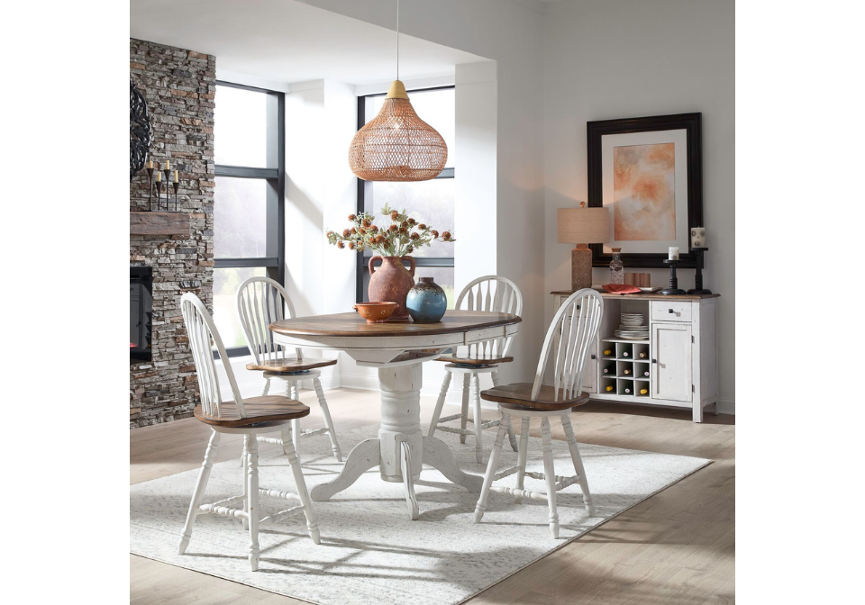 The Carolina Crossing Gathering Table set brings timeless style and everyday functionality to your dining space. Crafted of Rubberwood solids in a warm Antique Honey finish, this table features a 15-inch butterfly leaf, perfect for expanding your seating with ease. A rounded table edge softens the silhouette, while square bead molding along the apron adds a touch of traditional charm. The table is anchored by a multi-turned pedestal base with shaped bracket feet and adjustable floor levelers, offering both elegant detail and sturdy support for gatherings big and small.