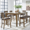 - Includes dining extension table, 4 side chairs, and bench.