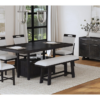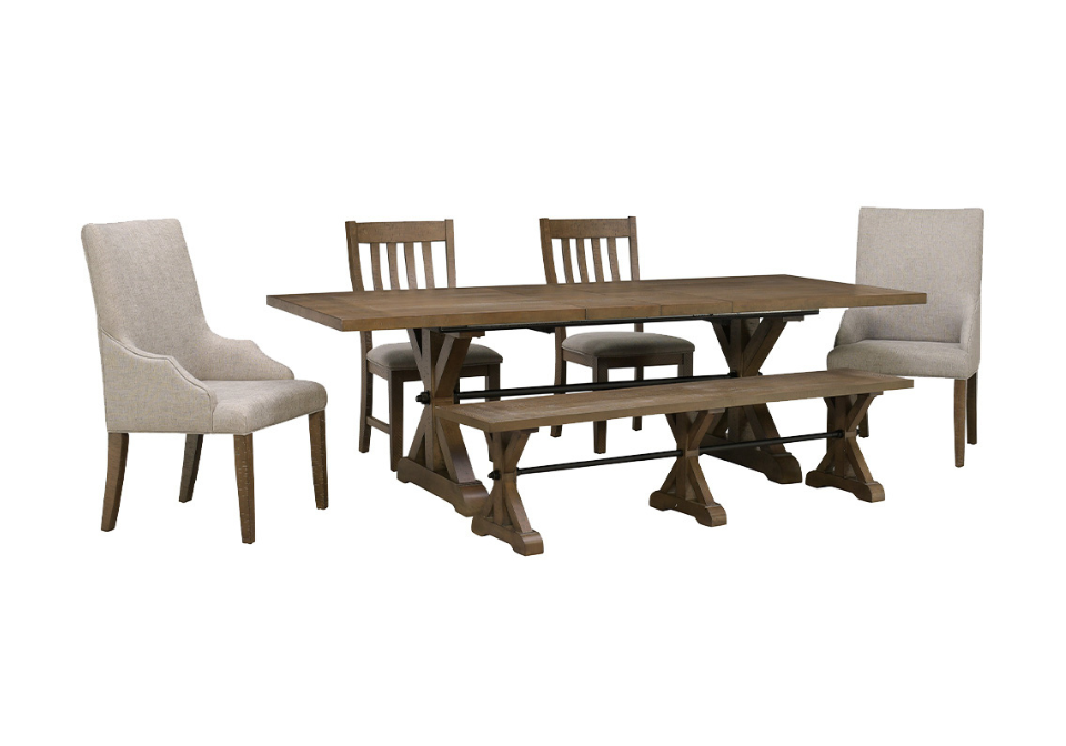 - Set includes: Rectangular Extension Dining Table (2 Leaves), 2 upholstered side chairs, 2 upholstered host chairs, and 1 dining bench.