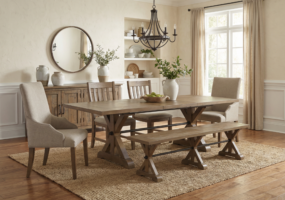 - Expandable trestle dining table: Two 12” leaves extend table length to 95″, ideal for holidays and dinner parties