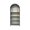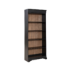 This TV console is finished throughout in a deep charcoal-black tone with subtle surface texture visible across the doors, top, and base. A stepped crown molding runs the full width at the top, above two recessed-panel doors flanking an open center section with a single interior shelf — each door fitted with a slim, dark bar pull. Decorative turned columns with carved detailing stand at each outer edge, adding a formal, architectural quality to the piece, which sits on a set of small square feet along a flat base molding.