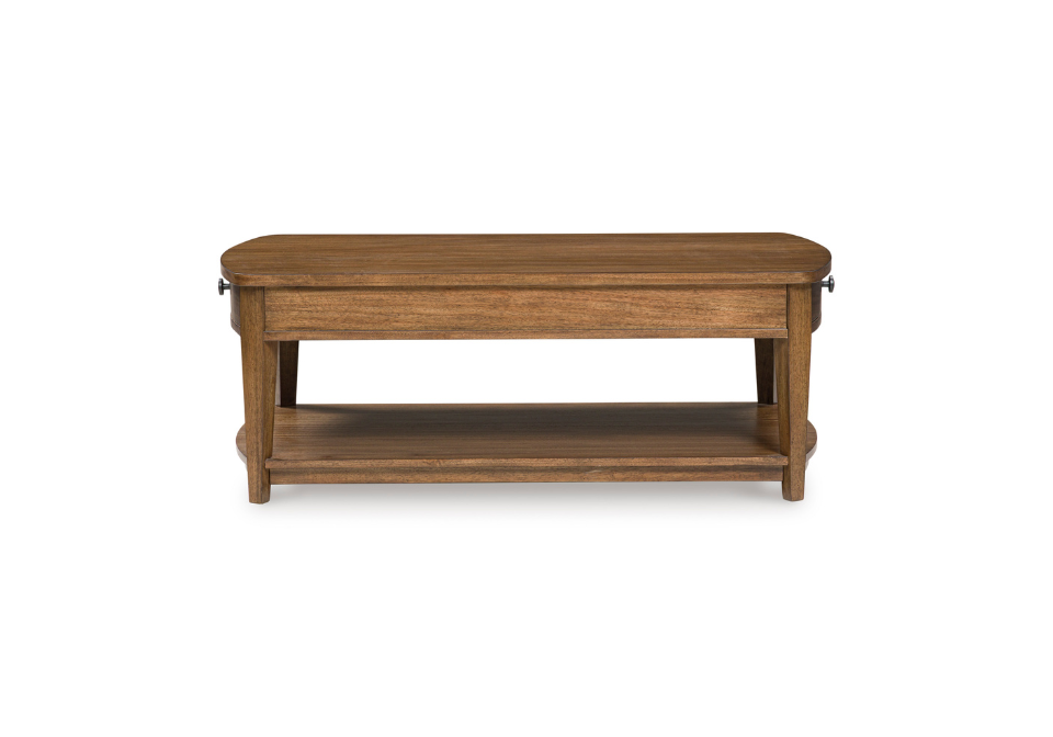 Serving up transitional style at its best, this striking coffee table looks equally at home in traditional and modern settings. Its classic brown finish merges effortlessly with a softly rounded top and tapered legs for a timeless, contemporary vibe. A lower shelf beautifully accommodates baskets, magazines, plants and more, while two end drawers keep entertainment essentials close by.