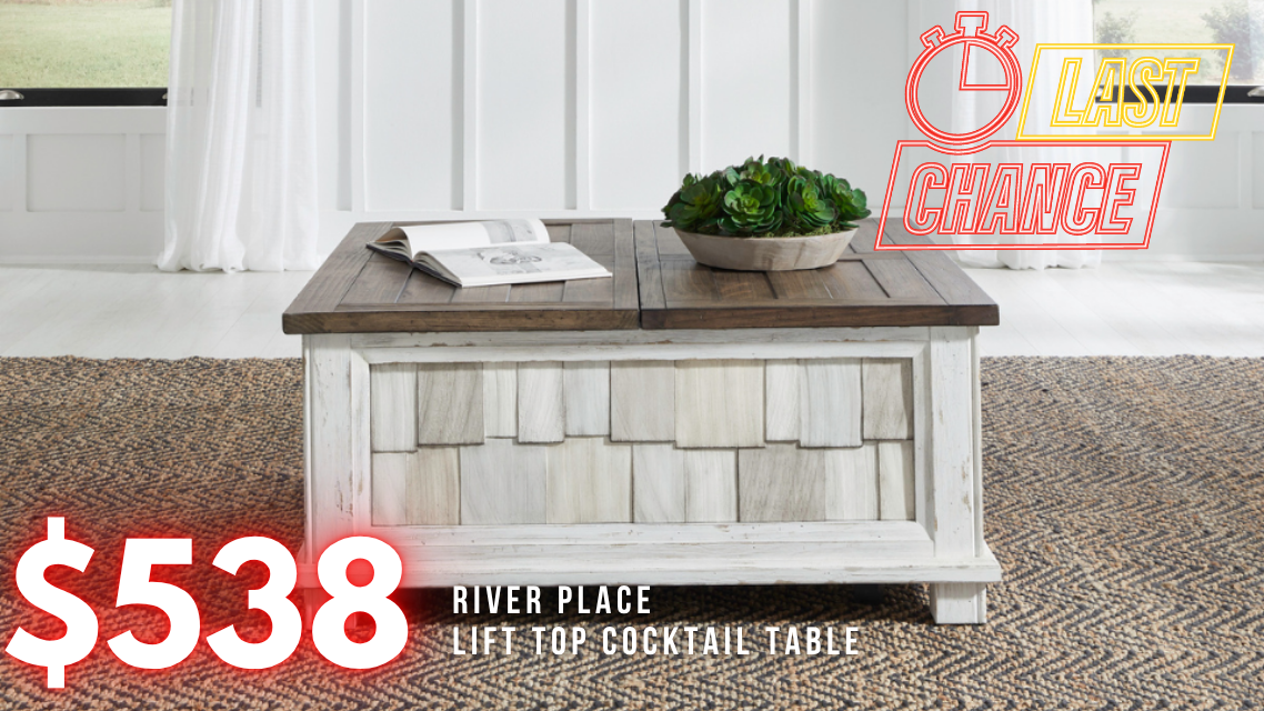 Create a calm and peaceful oasis with the River Place lift-top storage cocktail table. Crafted with Pine solids and veneers, this piece features a heavily distressed two-tone Riverstone White and Tobacco finish.