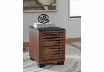 Double down on casual chic with the two-tone look of this chairside end table. Its warm brown and matte black finishes reflect your eye for modern design. The trend-right slatted styling brings added charm. And with a handy cabinet and shelf, keeping sofa-side essentials close is a breeze.