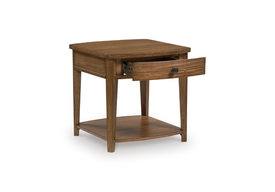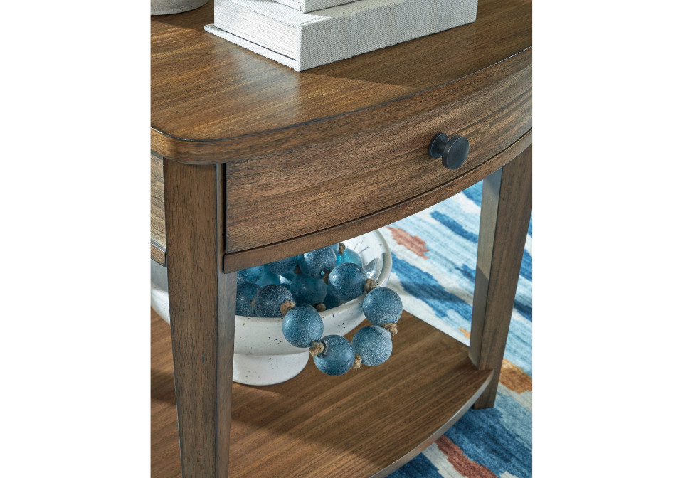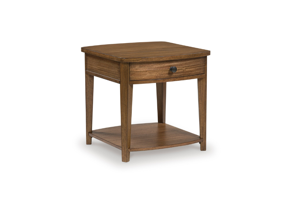Serving up transitional style at its best, this striking end table looks equally at home in traditional and modern settings. Its classic brown finish merges effortlessly with a softly rounded top and tapered legs for a timeless, contemporary vibe. A lower shelf beautifully accommodates baskets, magazines, plants and more, while the handy drawer keeps entertainment essentials close by.