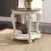 Elevating the art of traditional cottage styling, this chairside end table is sure to serve you beautifully for years to come. Antiqued two-tone aesthetic blends a chipped white with a distressed wood finished top for added charm. Cabinet door features inset mirror with filigree moulding for a fanciful twist.