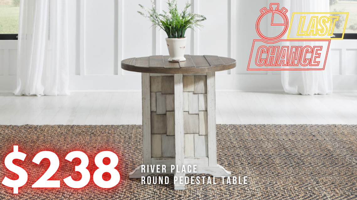 Create a calm and peaceful oasis with the River Place round chairside table. Crafted with Pine solids and veneers, this piece features a heavily distressed two-tone Riverstone White and Tobacco finish.