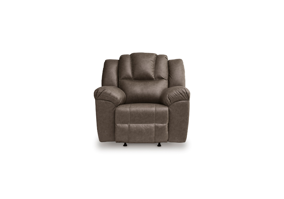 Ready to find your new favorite spot to unwind? This Lowilla rocker recliner is designed for maximum indulgence, with plush, pillowy cushions that provide ultimate support. Wrapped in supple yet durable faux leather that’s easy to clean, it’s just the ticket for movie nights and everyday life. And with one easy pull, you’re on your way to endless relaxation. Talk about the perfect blend of sink-in comfort and inviting contemporary style.