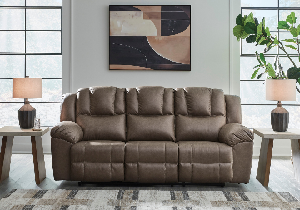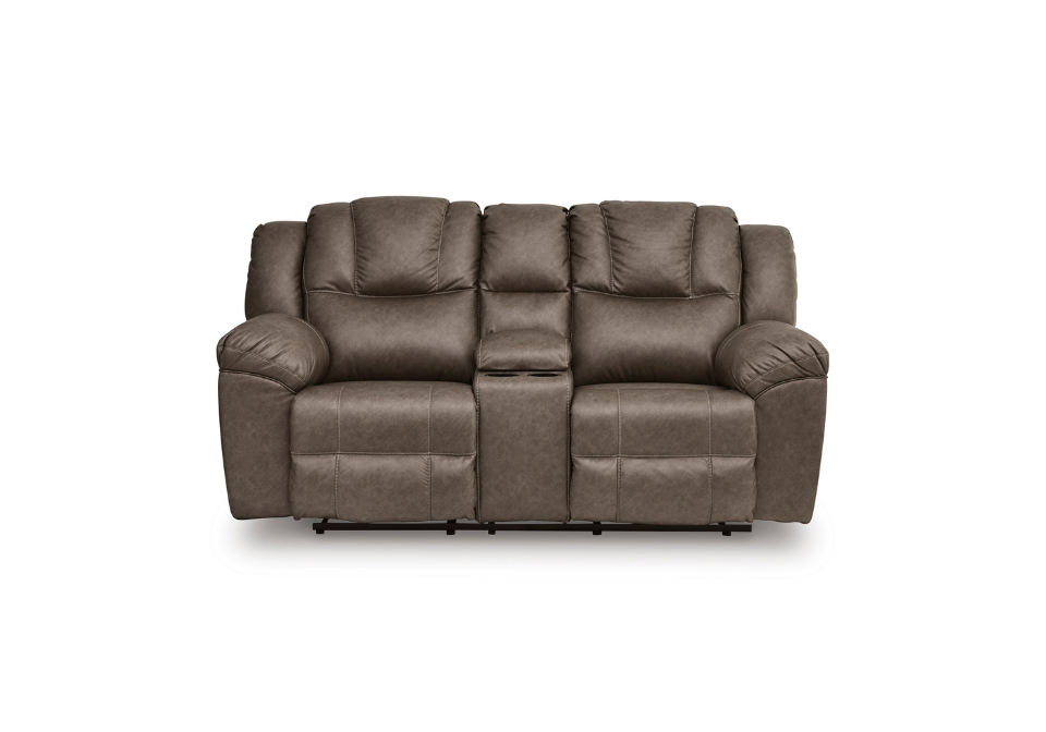 Ready to find your new favorite spot to unwind? This Lowilla reclining loveseat is designed for maximum indulgence, with plush, pillowy cushions that provide ultimate support. Wrapped in supple yet durable faux leather that’s easy to clean, it’s just the ticket for movie nights and everyday life. And with one easy pull, you’re on your way to endless relaxation. Talk about the perfect blend of sink-in comfort and inviting contemporary style.