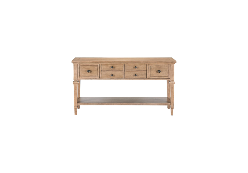 Create statuesque beauty and timeless elegance with the Haven Hills Sofa Table. Crafted of Rubberwood solids with Rustic Birch veneers in a warm Camel Beige finish, this piece combines classic design with practical storage. Block pilasters and square turned legs flow gracefully into an open bottom shelf, perfect for displaying décor or storing everyday essentials. Four drawers run the length of the table, featuring flat fronts for a clean, streamlined look. The two middle drawers are detailed with double score lines, creating the illusion of four smaller drawers, while the flanking drawers showcase traditional wood-framed fronts—adding heirloom quality and character loved for generations. The Haven Hills Sofa Table is a perfect blend of beauty and function for any living space.