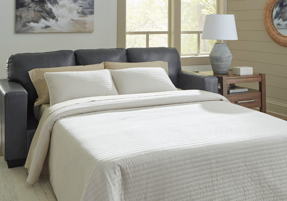 - Included bi-fold queen memory foam mattress sits atop a supportive steel frame