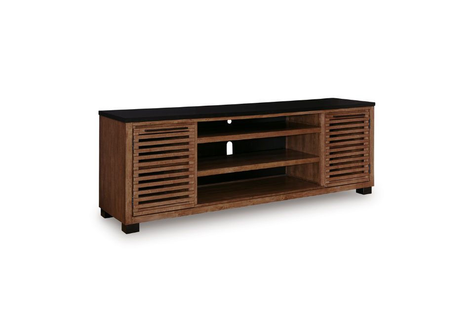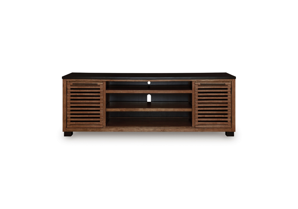 - Two-tone finish (medium warm brown wood tone and matte black)