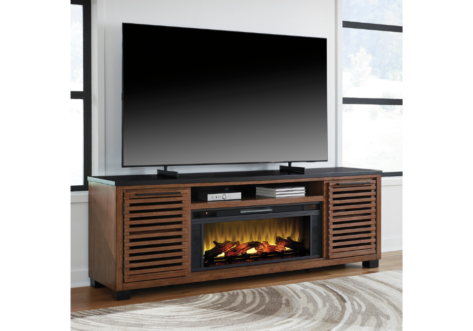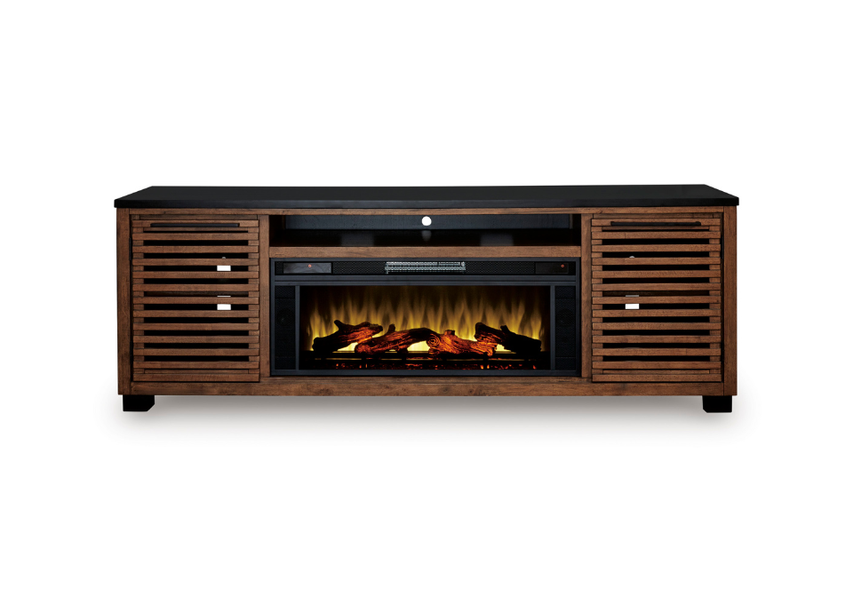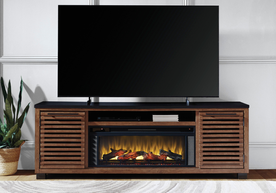 Double down on casual chic with the two-tone look of this TV stand with electric fireplace. Its warm brown and matte black finishes reflect your eye for modern design. The trend-right slatted styling brings added charm. And with handy cabinets, shelving and cord management holes, keeping entertainment consoles and accessories organized is a breeze. Enhancing the experience, the fireplace insert brings a touch of warmth and beautiful ambiance to your living room. With the touch of a button, adjust the temperature and the flame brightness, and connect your device to the built-in wireless speakers. The flame effect includes a realistic-looking log set with glowing embers, along with an ambient down light.